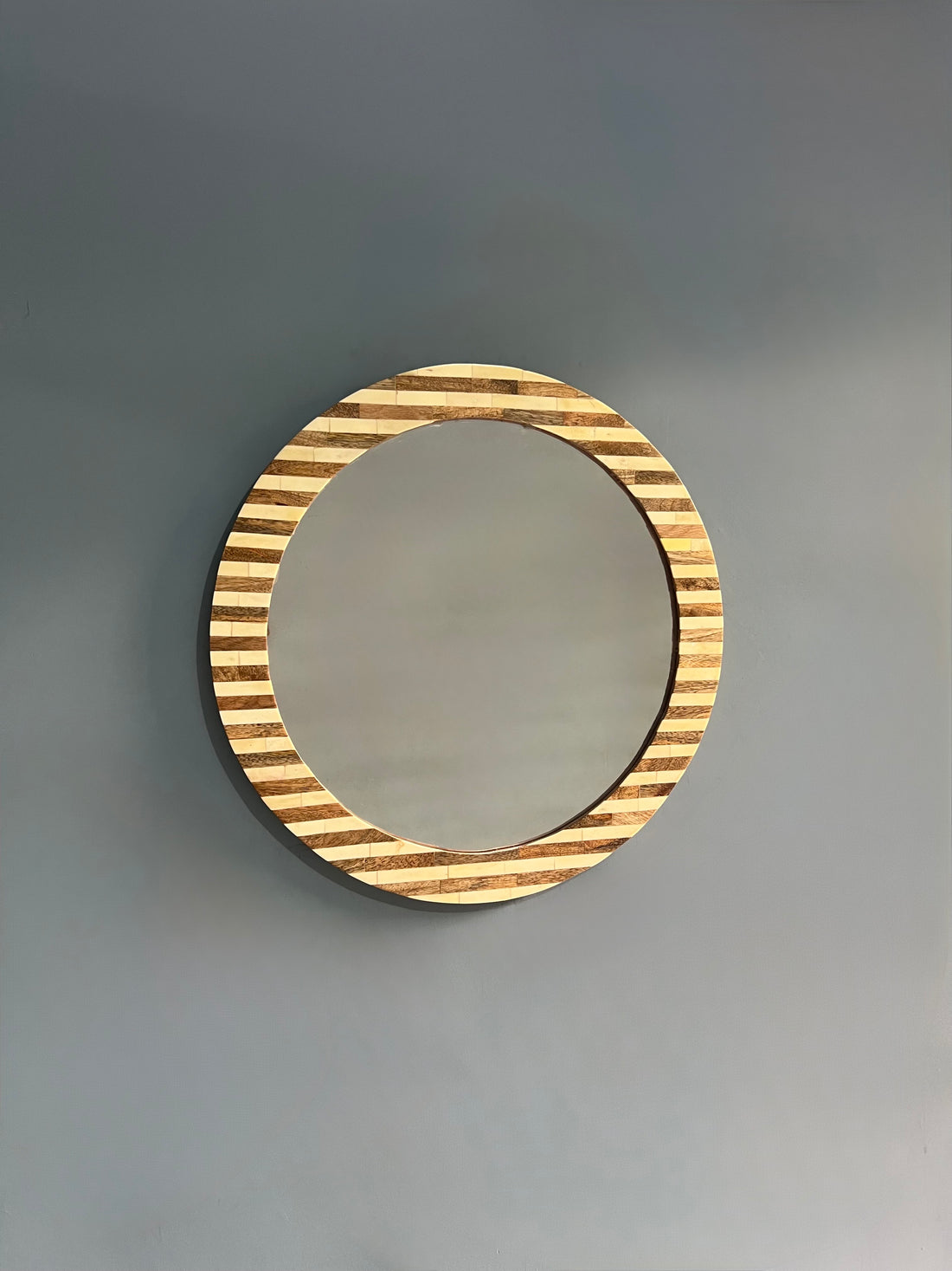 Elevate your interiors with this striking handcrafted wall mirror featuring a bold geometric inlay pattern....