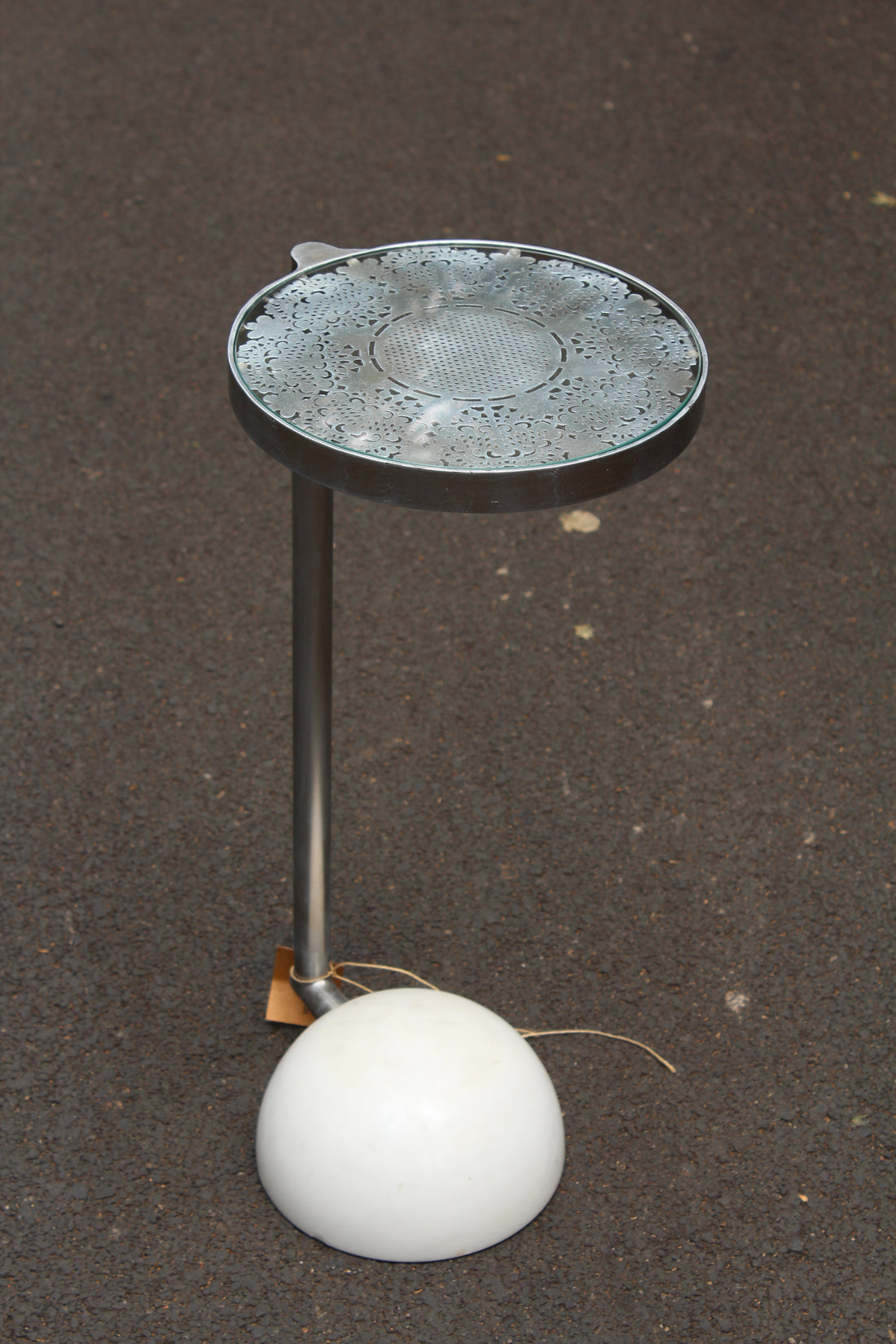 Bold in its form, this chic end table features an intricate metal etching sheet fixed into...