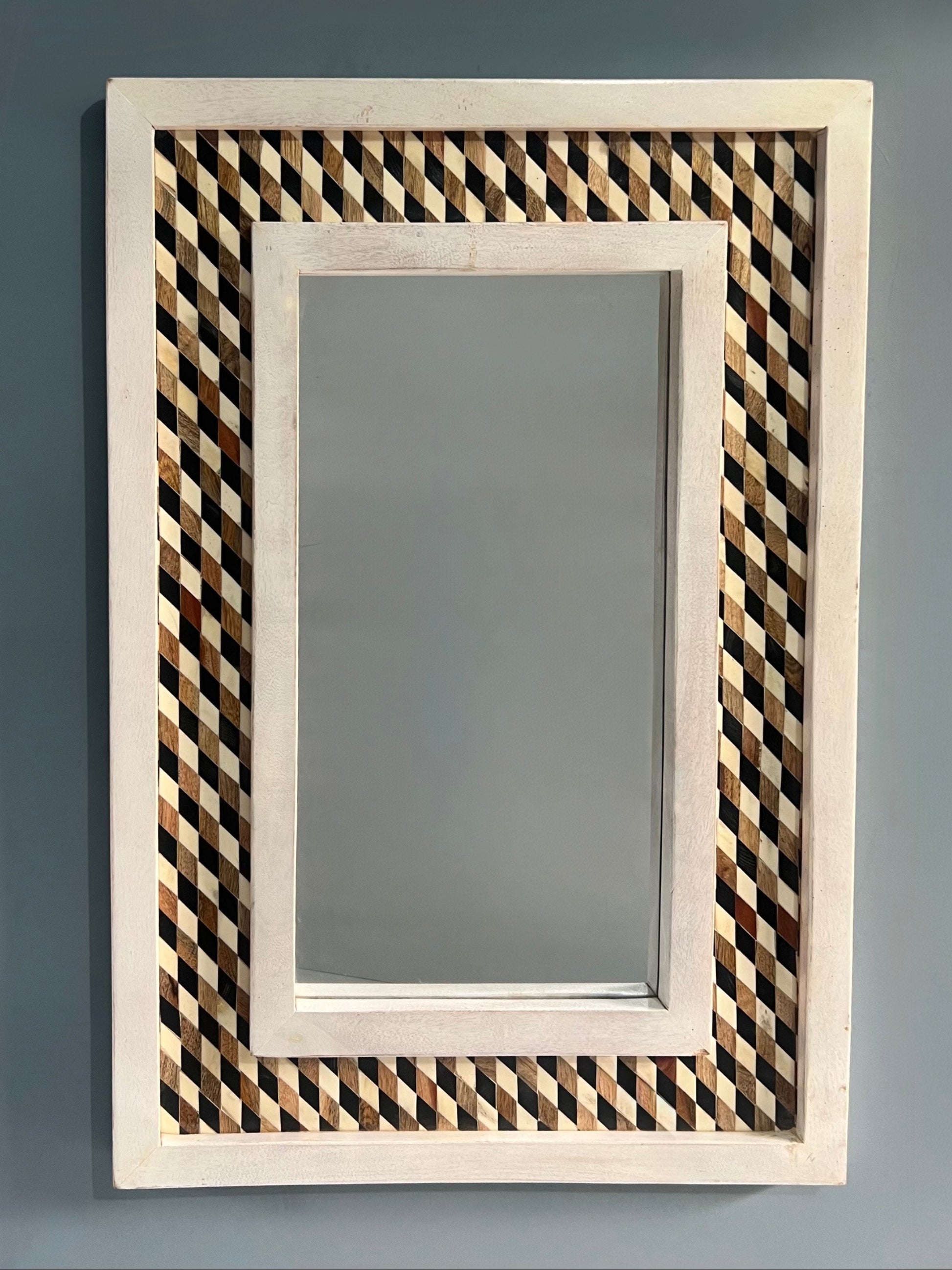 Elevate your interiors with this striking handcrafted wall mirror featuring a bold geometric inlay pattern. Expertly made with precision, the rectangular frame is adorned with a captivating diagonal design created using natural wood tones, ivory white, and black accents. The intricate craftsmanship and contrasting hues bring a sense of depth and movement, turning a functional mirror into a statement piece. Perfect for entryways, living rooms, or dressing corners, this mirror combines traditional artistry with a modern edge. The sturdy wooden frame is finished in a subtle whitewash, adding a touch of rustic charm while allowing the pattern to take center stage. Dimensions: 36 *24 inches Bring home a piece that reflects not just your image, but your taste in design.